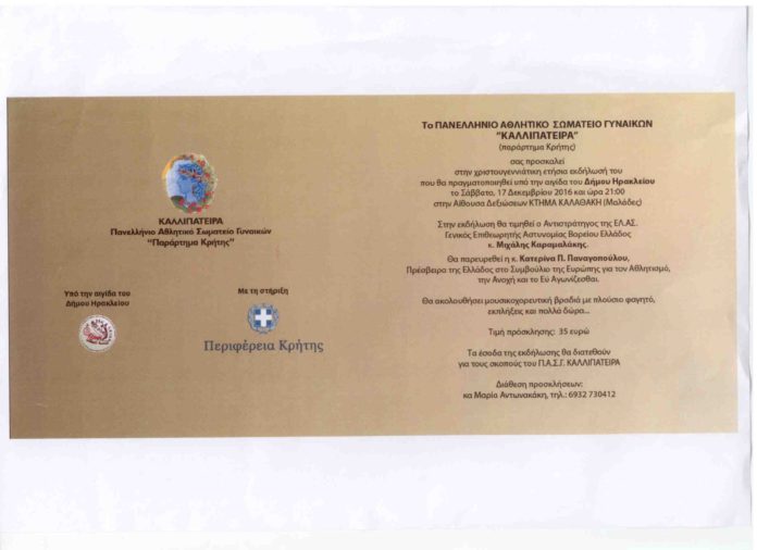 Την ετήσια Χριστουγεννιάτικη εκδήλωση του πραγματοποιεί το Σάββατο 17 Δεκεμβρίου 2016 στο «ΚΤΗΜΑ ΚΑΛΑΘΑΚΗ» ” το ΠΑΝΕΛΛΗΝΙΟ ΑΘΛΗΤΙΚΟ ΣΩΜΑΤΕΙΟ ΓΥΝΑΙΚΩΝ “ΚΑΛΛΙΠΑΤΕΙΡΑ”.