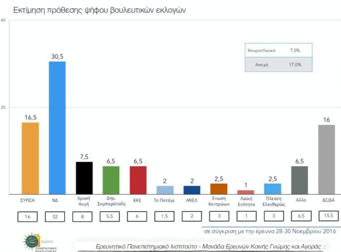 Η ΝΔ διατηρεί το άνετο προβάδισμα 14 ποσοστιαίων μονάδων, με τον ΣΥΡΙΖΑ να σημειώνει 16,5% (μικρή αύξηση έναντι του 16% το Νοέμβριο πάντως), η ΝΔ 30,5% (έναντι 32%), ηΧΑ