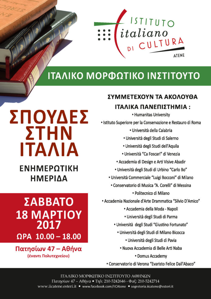 ΠΑΙΔΕΙΑ Ενημερωτική μερίδα για τις σπουδές στην Ιταλία 15 Μαρτίου 2017 38 Κοινοποίηση :Σάββατο 18 Μαρτίου 2017 10.00 – 18.00 Ιταλικό Μορφωτικό Ινστιτούτο Πατησίων 47 – έναντι Πολυτεχνείου ΕΙΣΟΔΟΣ ΕΛΕΥΘΕΡΗ Ακολουθήστε το Entospolis στο Facebook Κοινοποίηση :
