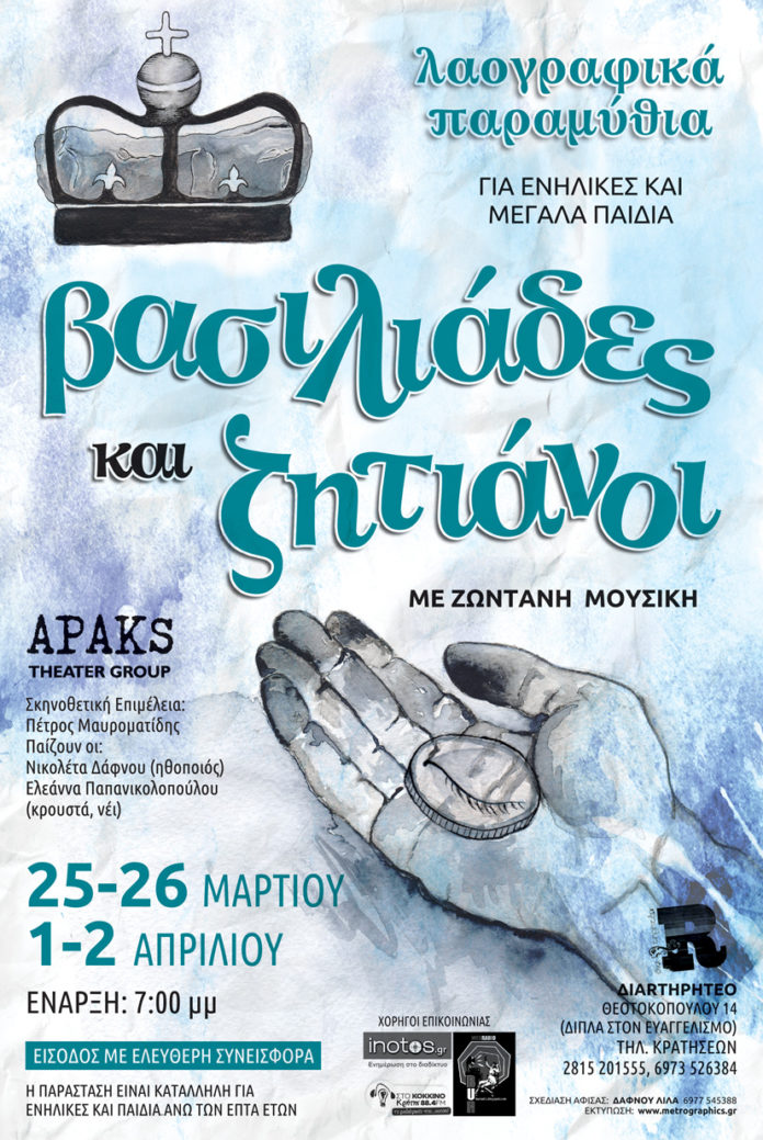 Η θεατρική ομάδα «APAKS theatergroup»μετά την περσινή της επιτυχία «Γιουδήθ – η γυναίκα στον Καββαδία» που περιόδευσε με ενθουσιώδεις κριτικές σε όλη την Κρήτη, σας προσκαλεί στην παράσταση «Βασιλιάδες και ζητιάνοι», βασισμένη σε παραμύθια και μουσικές από όλον τον κόσμο.