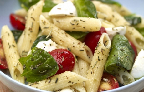Σε μια κατσαρόλα βράζουμε τα ζυμαρικά για περίπου 15 λεπτά και τα κρυώνουμε σε τρεχούμενο νερό. Κόβουμε σε τέταρτα τη μοτσαρέλα και κόβουμε το σπανάκι με τα χέρια σε μεγάλα κομμάτια. Σε ένα μπολ βάζουμε τα ζυμαρικά, τη μοτσαρέλα, τα ντοματίνια και το σπανάκι και προσθέτουμε και τα υπόλοιπα υλικά (λάδι, λεμόνι και ξύδι). Τέλος, προσθέτουμε τα μπαχαρικά μας, ανακατεύουμε καλά και σερβίρουμε.