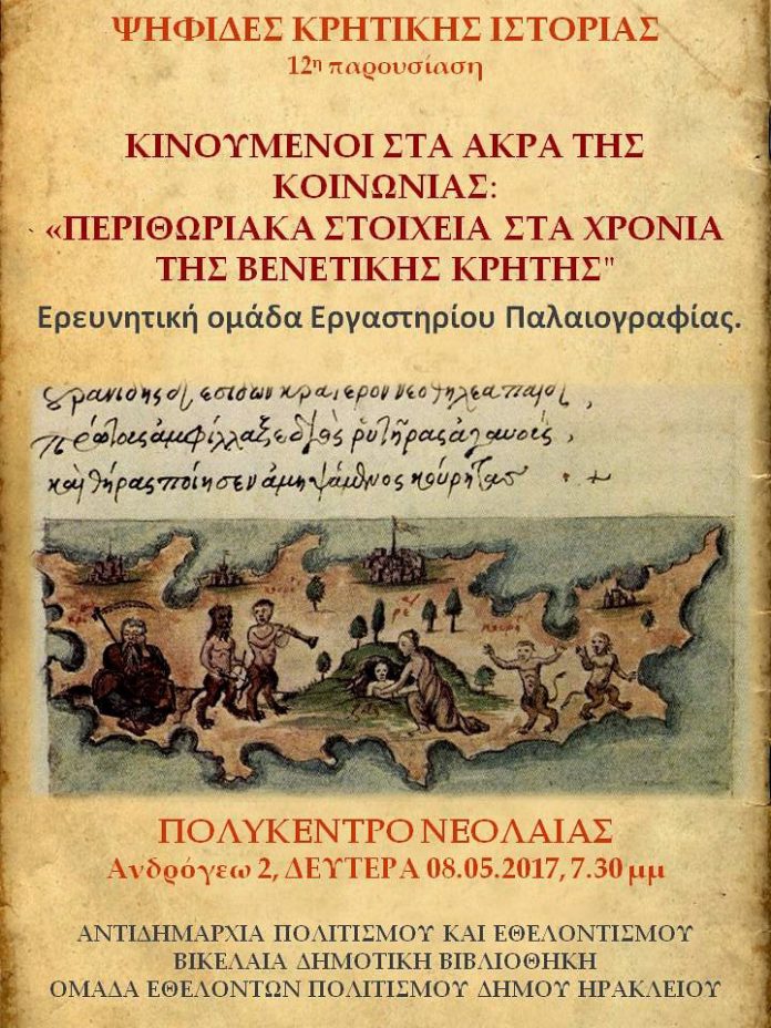 Η Αντιδημαρχία Πολιτισμού και Εθελοντισμού, η Βικελαία Δημοτική Βιβλιοθήκη και η Ομάδα Εθελοντών Πολιτισμού Δήμου Ηρακλείου συνεχίζει τη σειρά παρουσιάσεων θεμάτων κρητικής ιστορίας. Η 12η παρουσίαση, είναι ένα αφιέρωμα στο περιθωριακό στοιχείο και θα πραγματοποιηθεί σε δύο μέρη.