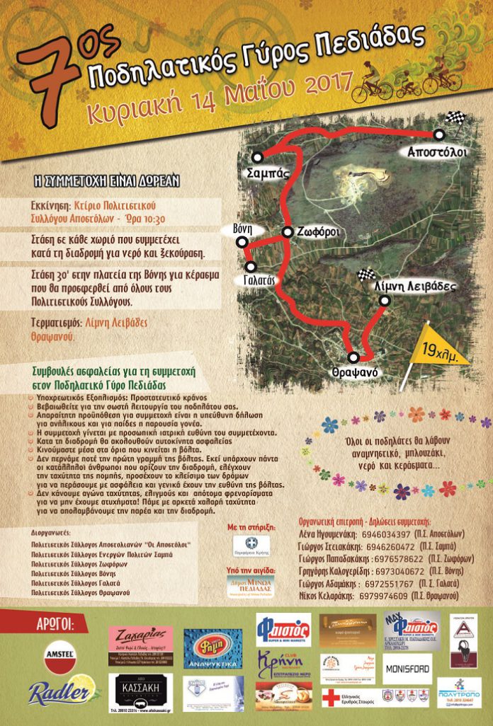 Με την στήριξη της Περιφέρειας Κρήτης θα πραγματοποιηθεί ο «7ος Ποδηλατικός Γύρος Πεδιάδας» που συνδιοργανώνεται από τους πολιτιστικούς συλλόγους Αποστόλων, Ενεργών Πολιτών Σαμπά, Ζωφόρων, Βόνης, Γαλατά Θραψανού, την αιγίδα του Δήμου Μινώα Πεδιάδας, την Κυριακή 14 Μαΐου 2017 στις 10:30 το πρωί με εκκίνηση στο κτίριο του Πολιτιστικού Συλλόγου του χωριού Αποστόλων Πεδιάδας.