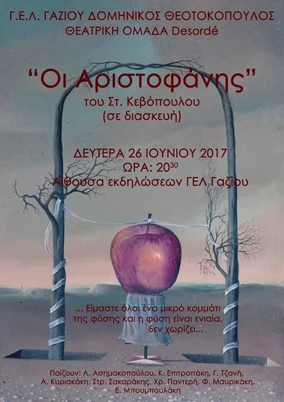 Tη Δευτέρα 26 Ιουνίου 2017 και ώρα 8.30 μ. μ το ΓΕΛ Γαζίου παρουσιάζει τη θεατρική παράσταση «Οι Αριστοφάνης» του Στ. Κεβόπουλου σε διασκευή από τη θεατρική ομάδα Desorde στην αίθουσα εκδηλώσεων του σχολείου.