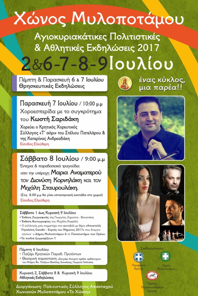 2-3Με την στήριξη της Περιφέρειας Κρήτης του Δήμου Μυλοποτάμου και του Ομίλου Υπεραποστάσεων Κρήτης θα πραγματοποιηθούν οι θρησκευτικές, πολιτιστικές και αθλητικές εκδηλώσεις, που οργανώνει με την  ευκαιρία του εορτασμού της Αγίας Κυριακής, από την Πέμπτη 6 Ιουλίου μέχρι και την Κυριακή 9  Ιουλίου στο Χώνος Μυλοποτάμου, ο Πολιτιστικός Σύλλογος των Απανταχού “Χωνιανιανών” Μυλοποτάμου «Το Χώνος».