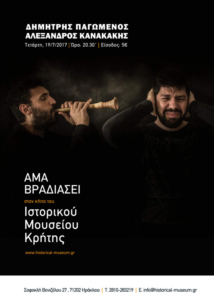 Τραγούδια για την καλοκαιρινή νύχτα, ποτό ανάμεσα σε φίλους και η ευκαιρία για μια αυτόνομη βραδινή περιήγηση στις Συλλογές του ΙΜΚ και την περιοδική έκθεση Γιάννης Σπυρόπουλος / Διάλογος με το Αόρατο αποτελούν ιδανικά συστατικά μιας μικρής ευχάριστης απόδρασης, άμα βραδιάσει, στον κήπο του Ιστορικού Μουσείου Κρήτης.