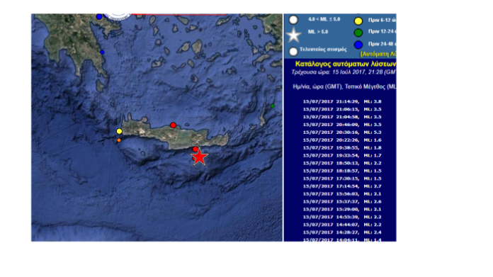 «Εκ μέρους των τεσσάρων φορέων συγκρότησης του Εθνικού Σεισμολογικού Δικτύου, το Γεωδυναμικό Ινστιτούτο του Εθνικού Αστεροσκοπείου Αθηνών ανακοινώνει ότι σήμερα (σ.σ. χθες) στις 23:30 ώρα Ελλάδος, οι σεισμογράφοι τους κατέγραψαν ισχυρή σεισμική δόνηση, με μέγεθος 5,3 βαθμών της κλίμακας Ρίχτερ, που προέρχεται από απόσταση 377 χιλιομέτρων νότια-νοτιανατολικά της Αθήνας. Το επίκεντρο της δόνησης εντοπίζεται στο θαλάσσιο χώρο 33χιλιόμετρα δυτικά -νοτιοδυτικά της Ιεράπετρας».