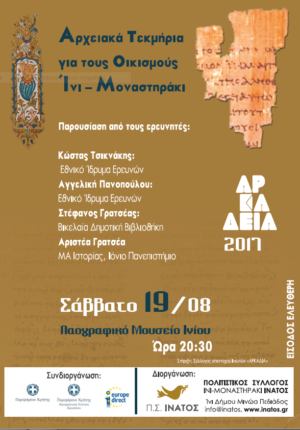 Ο Πολιτιστικός Σύλλογος Ίνι – Μοναστηράκι «ΙΝΑΤΟΣ» σε συνδιοργάνωση με την Περιφέρεια Κρήτης – Περιφερειακή Ενότητα Ηρακλείου στο πλαίσιο των εκδηλώσεων «ΑΡΚΑΔΕΙΑ 2017» πραγματοποιεί εκδήλωση με τίτλο «Αρχειακά Τεκμήρια για τους Οικισμούς Ίνι – Μοναστηράκι» το Σάββατο 19 Αυγούστου στις 20:30 στο Λαογραφικό Μουσείο Ινίου, του Δήμου Μινώα Πεδιάδας.