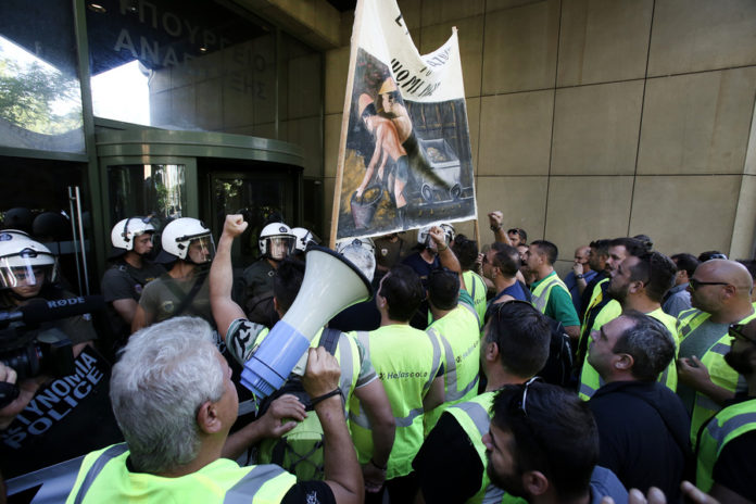 Οι μεταλλωρύχοι διαμαρτύρονται για τις εξελίξεις με την Eldorado Gold και ζητούν από την κυβέρνηση να δώσει τις άδειες που ζητά η επιχείρηση ώστε να μην χάσουν τη δουλειά τους.