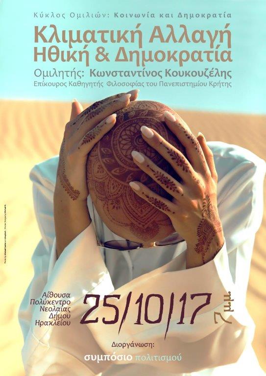 Η απληστία της εκμετάλλευσης της Φύσης από τον άνθρωπο για συνεχή κερδοφορία, έχει μεταβάλλει τον πλανήτη σε μια ανοιχτή πληγή . Οικοσυστήματα καταρρέουν, ζωικά και φυτικά είδη εξαφανίζονται, οι παγετώνες λιώνουν με μεγάλη ταχύτητα στον Βόρειο Πόλο και η τροπόσφαιρα έχει γεμίσει δηλητηριώδεις χημικές ουσίες οι οποίες καθημερινώς μεταλλάσσονται από το φως του ήλιου. «Το Συμπόσιο Πολιτισμού», πρώην Κιβώτιο Πολιτισμού, διοργανώνει μία εκρηκτικά επίκαιρη εκδήλωση με θέμα : «Κλιματική Αλλαγή , Ηθική και Δημοκρατία», με ομιλητή τον Επίκουρο Καθηγητή Φιλοσοφίας του Πανεπιστημίου Κρήτης, Κωνσταντίνο Κουκουζέλη. Η εκδήλωση θα πραγματοποιηθεί την προσεχή Τετάρτη 25 Οκτωβρίου στο Πολύκεντρο Νεολαίας του Δήμου Ηρακλείου Κρήτης στις 7 το βράδυ.