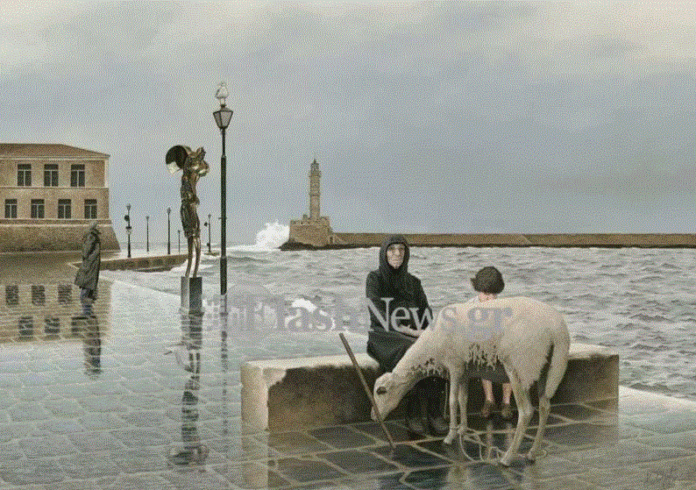 «Παρατηρούμε μια μουντή χειμερινή ημέρα στο παλιό λιμάνι Χανίων, με μια καταιγίδα να έρχεται από πολύ μακριά. Τόσο το μπρούτζινο άγαλμα όσο και μια γυναίκα στέκονται “φρουροί” για μια ενδεχόμενη απειλή που πλησιάζει την πόλη των Χανίων.»