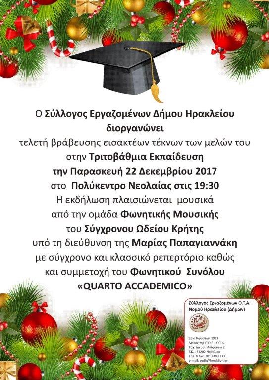 Μουσικό πλαισίωμα, από την ομάδα φωνητικής μουσικής του Σύγχρονου Ωδείου Κρήτης υπό τη διεύθυνση της Μαρίας Παπαγιαννάκημε σύγχρονο και κλασικό ρεπερτόριο καθώς και τη συμμετοχή του φωνητικού Συνόλου «QUARTO ACCADEMICO», για την τελετή βράβευσης των εισακτέων τέκνων στην Τριτοβάθμια Εκπαίδευση των μελών του Συλλόγου Εργαζομένων Δήμου Ηρακλείου.