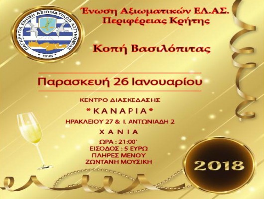 Την Παρασκευή 26 Ιανουαρίου 2017 και ώρα 21:00΄ στο κέντρο διασκέδασης “ΚΑΝΑΡΙΑ” στα Χανιά, οδός Ηρακλείου 27 & Ι. Αντωνιάδη 2 (δίπλα στο Αστυνομικό Μέγαρο Χανίων) η Ένωση Αξιωματικών ΕΛ.ΑΣ. Περιφέρειας Κρήτης θα κόψει τη πρωτοχρονιάτικη πίτα της.