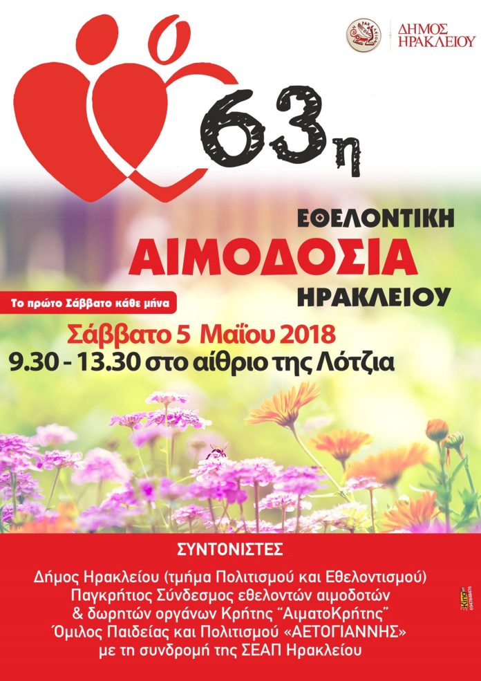 Εθελοντική Αιμοδοσία θα πραγματοποιηθεί το Σάββατο 05.05.2018 στο κέντρο της πόλης του Ηρακλείου (στο Αίθριο της Λότζια), και ώρες 10:00 – 13:30. Πρόκειται για μια κοινή προσπάθεια αιμοδοσίας εθελοντικών σωματείων και οργανώσεων του Ηρακλείου, την οποία συντονίζουν: