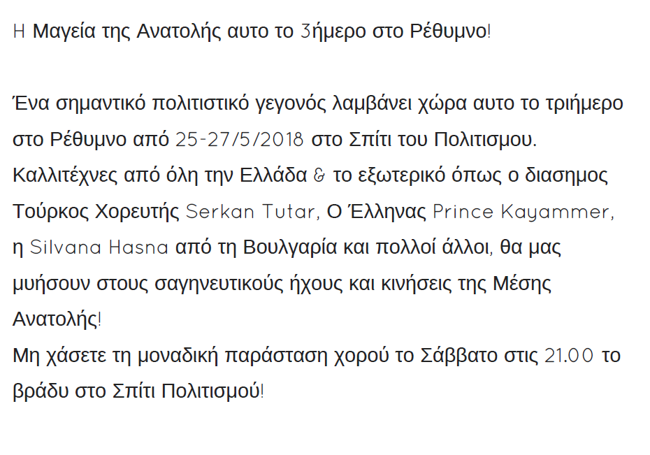 ΕΠΙΚΑΙΡΟΤΗΤΑ Η Μαγεία της Ανατολής αυτό το 3ήμερο στο Ρέθυμνο! 24 Μαΐου 2018 93 Κοινοποίηση : Ακολουθήστε το Entospolis στο Facebook Κοινοποίηση :