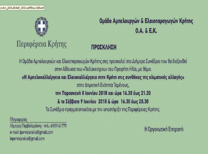 «Η Αμπελοκαλλιέργεια και Ελαιοκαλλιέργεια στην Κρήτη στις συνθήκες κλιματικής αλλαγής» είναι το θέμα του διήμερου συνεδρίου που διοργανώνει η Ομάδα Αμπελουργών και Ελαιοπαραγωγών Κρήτης με την στήριξη της Περιφέρειας Κρήτης, την Παρασκευή 8 και το Σάββατο 9 Ιουνίου 2018 στο «Πολύκεντρο» της Δημοτικής Ενότητας Τεμένους, στον Προφήτη Ηλία Δήμου Ηρακλείου.