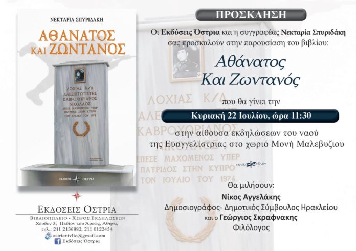 Οι Εκδόσεις ΟΣΤΡΙΑ και η συγγραφέας Νεκταρία Σπυριδάκη σας προσκαλούν στην παρουσίαση του βιβλίου ”Αθάνατος και Ζωντανός”την Κυριακή 22 Ιουλίου στις 11.30 στο χωριό Μονή Μαλεβυζίου.