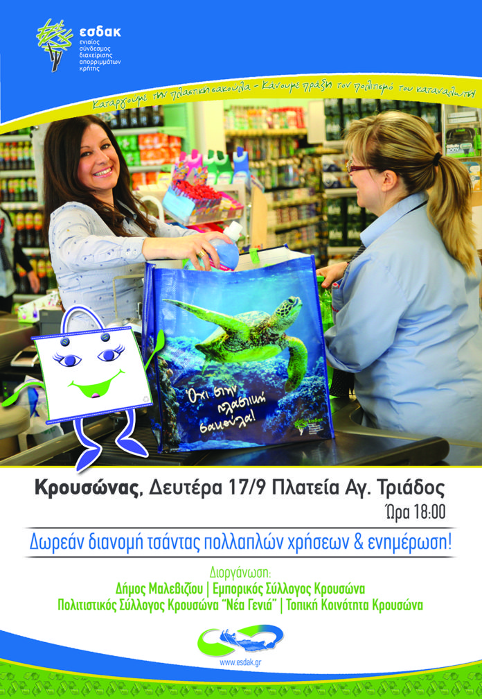 Με μια ακόμα δράση ενημέρωσης και ευαισθητοποίησης για την μείωση της χρήσης της πλαστικής σακούλας στον Κρουσώνα, συνεχίζεται η μεγάλη εκστρατεία του Ενιαίου Συνδέσμου Διαχείρισης Απορριμμάτων Κρήτης – Ε.Σ.Δ.Α.Κ..