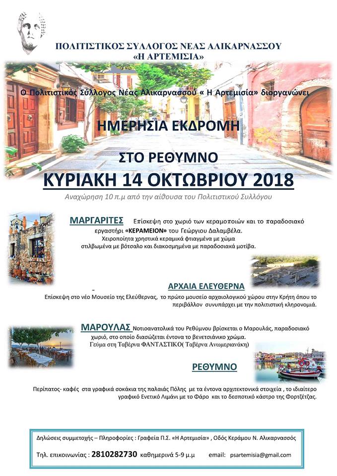 ΠΟΛΙΤΗΣ Ημερήσια εκδρομή στο Ρέθυμνο από τον Πολιτιστικό Σύλλογος Ν. Αλικαρνασσού “Η Αρτεμισία” 27 Σεπτεμβρίου 2018 27 Κοινοποίηση :Ακολουθήστε το Entospolis στο Facebook Κοινοποίηση :