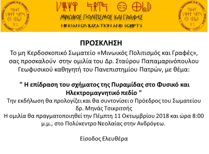 Το μη Κερδοσκοπικό Σωματείο “Μινωικός Πολιτισμός και Γραφές” διοργανώνουν την ομιλία του Δρ. Σταύρου Παπαμαρινόπουλου, Γεωφυσικού Καθηγητή του Πανεπιστημίου Πατρών, με θέμα: “Η επίδραση του σχήματος της Πυραμίδας στο Φυσικό και Ηλεκτρομαγνητικό Πεδίο”.