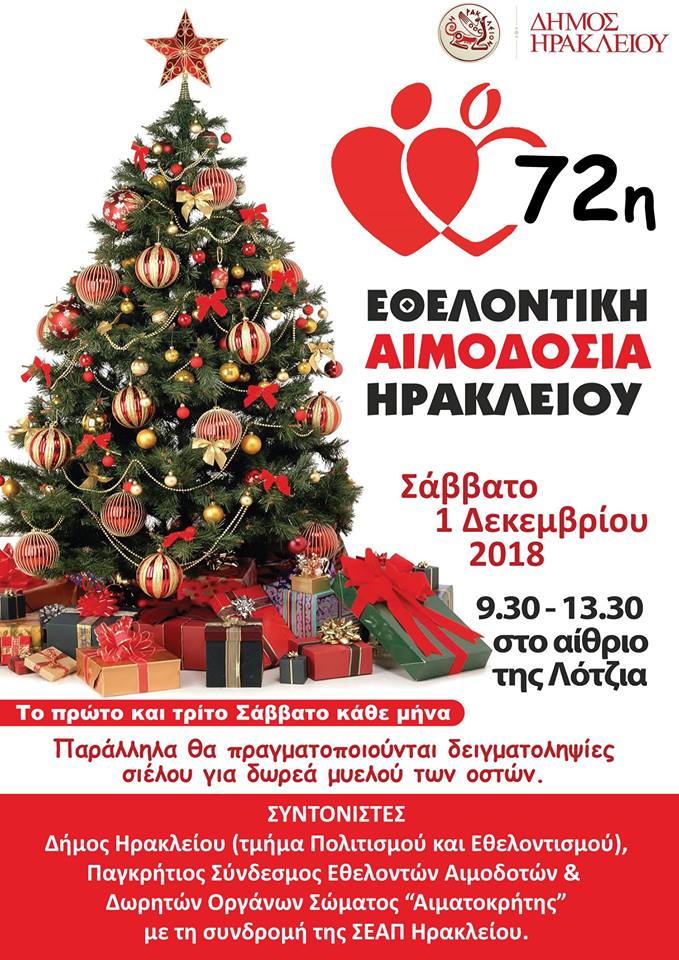 Εθελοντική Αιμοδοσία θα πραγματοποιηθεί το Σάββατο 01.12.2018 στο κέντρο της πόλης του Ηρακλείου (στο Αίθριο της Λότζια), και ώρες 10:00 – 13:30. Πρόκειται για μια κοινή προσπάθεια αιμοδοσίας, την οποία συντονίζουν:
