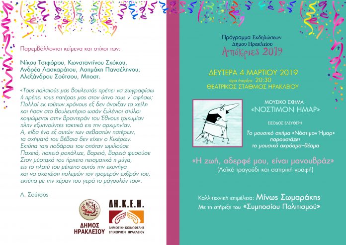 Το μουσικό σχήμα «Νόστιμονήμαρ», στο πλαίσιο των αποκριάτικων εκδηλώσεων του Δήμου Ηρακλείου και με τη στήριξη του «Συμποσίου Πολιτισμού», θα παρουσιάσει το μουσικό ακρόαμα – θέαμα με τίτλο: «Η ζωή αδερφέ μου είναιμανουβράζ»,επιλεγμένο από στίχο λαϊκού τραγουδιού και λαϊκής γραφής, στον Θεατρικό Σταθμό Ηρακλείου, την Δευτέρα 4 Μαρτίου, ώρα 8.30μμ.