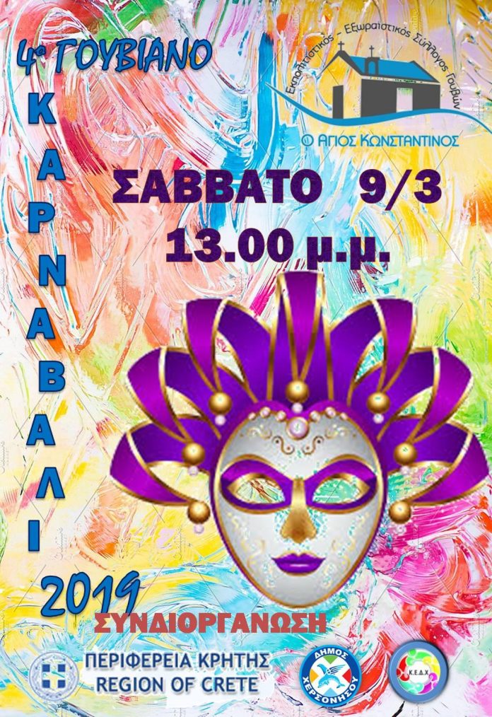Σε ξέφρενους ρυθμούς αποκριάς ετοιμάζεται ο Πολιτιστικός Σύλλογος Γουβών  για τη διοργάνωση του  4ου   «Γουβιανού  Καρναβαλιού» που θα πραγματοποιηθεί με την συνδιοργάνωση της Περιφέρειας Κρήτης το Σάββατο  9  Μαρτίου 2019 και ώρα 13:00. Όσοι θέλουν να λάβουν μέρος στο καρναβάλι μπορούν να επικοινωνούν στο τηλέφωνο: 6945-900335
