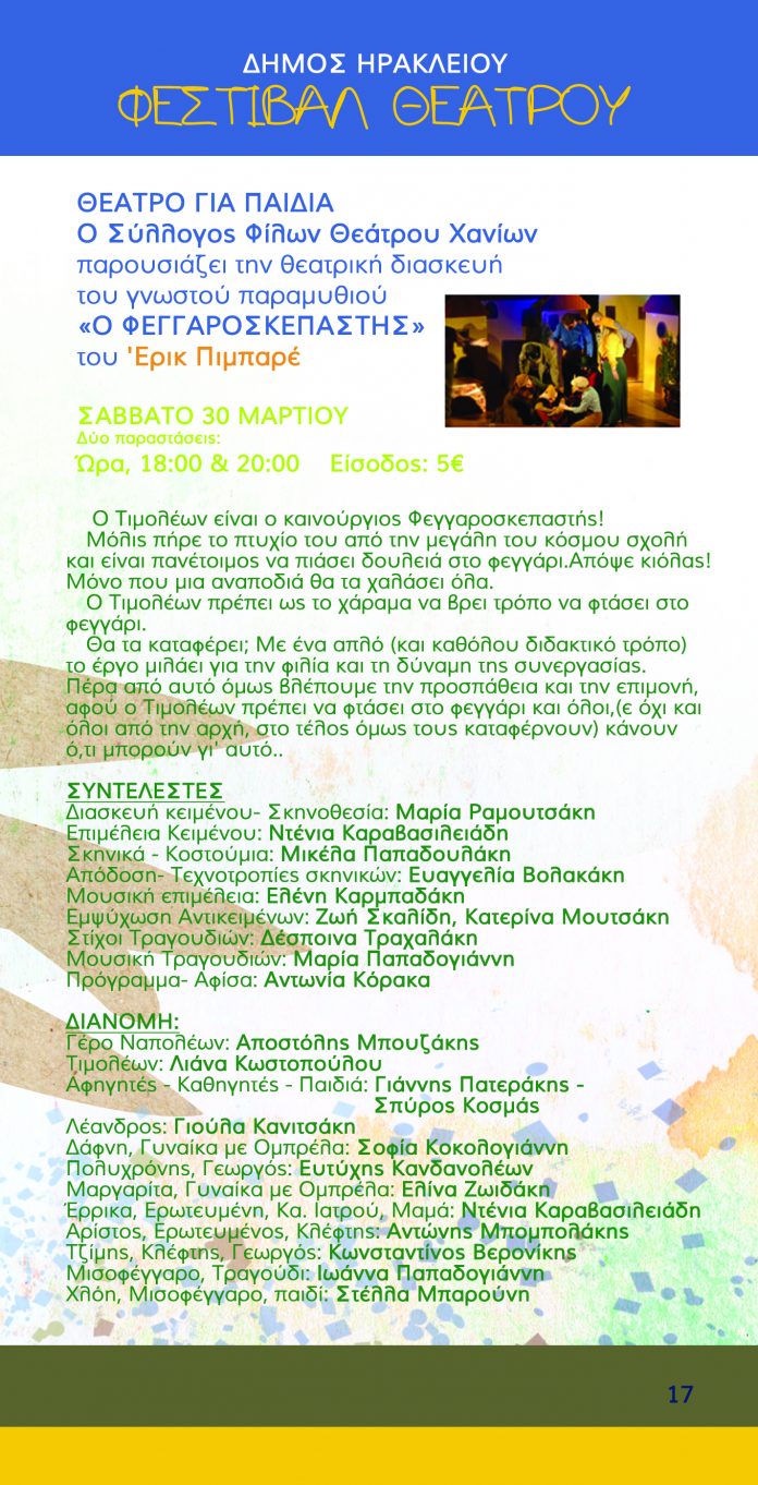Ο Σύλλογος Φίλων Θεάτρου Χανίων  παρουσιάζει την θεατρική διασκευή του γνωστού παραμυθιού «Ο ΦΕΓΓΑΡΟΣΚΕΠΑΣΤΗΣ» του ‘Ερικ Πιμπαρέ