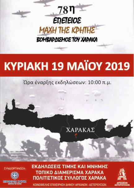 Εκδηλώσεις τιμής και μνήμης για την 78η επέτειο της Μάχης της Κρήτης και του βομβαρδισμού του Χάρακα από τη Γερμανική Αεροπορία συνδιοργανώνουν ο Πολιτιστικός Σύλλογος Χάρακα «ο Άγιος Παντελεήμονας», ο Δήμος Αρχανών-Αστερουσίων και η Περιφέρεια Κρήτης την Κυριακή 19 Μαΐου.