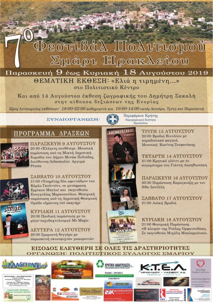 Ο Πολιτιστικός Σύλλογος Σμαρίου, το Τοπικό Συμβούλιο και το Ενοριακό Συμβούλιο, με τη στήριξη της Περιφέρειας Κρήτης-ΠΕ Ηρακλείου, διοργανώνουν το «7ο Φεστιβάλ Πολιτισμού», το οποίο θα διαρκέσει από τις 9 Αυγούστου έως στις 18 Αυγούστου 2019. Στα πλαίσια του Φεστιβάλ, θα λειτουργεί η έκθεση «Ελιά η τιμημένη…» στο Πολιτιστικό Κέντρο Σμαρίου και έκθεση ζωγραφικής του Δημήτρη Σακαλή στην αίθουσα δεξιώσεων της Ενορίας. Παράλληλα θα πραγματοποιούνται ποικίλες δραστηριότητες με ελεύθερη είσοδο για το κοινό.