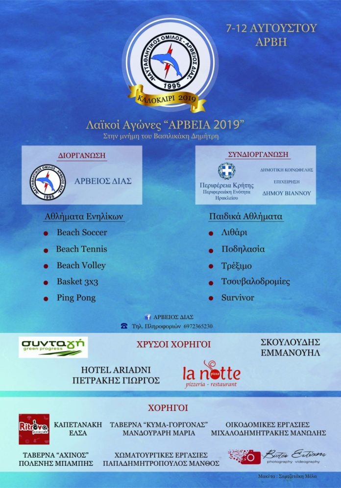 Ο Ναυταθλητικός Όμιλος Άρβειος «Δίας» για 24η χρονιά διοργανώνει τα «Άρβεια» λαϊκούς αγώνες που προάγουν την άμιλλα, το αθλητικό πνεύμα, την ομαδικότητα.