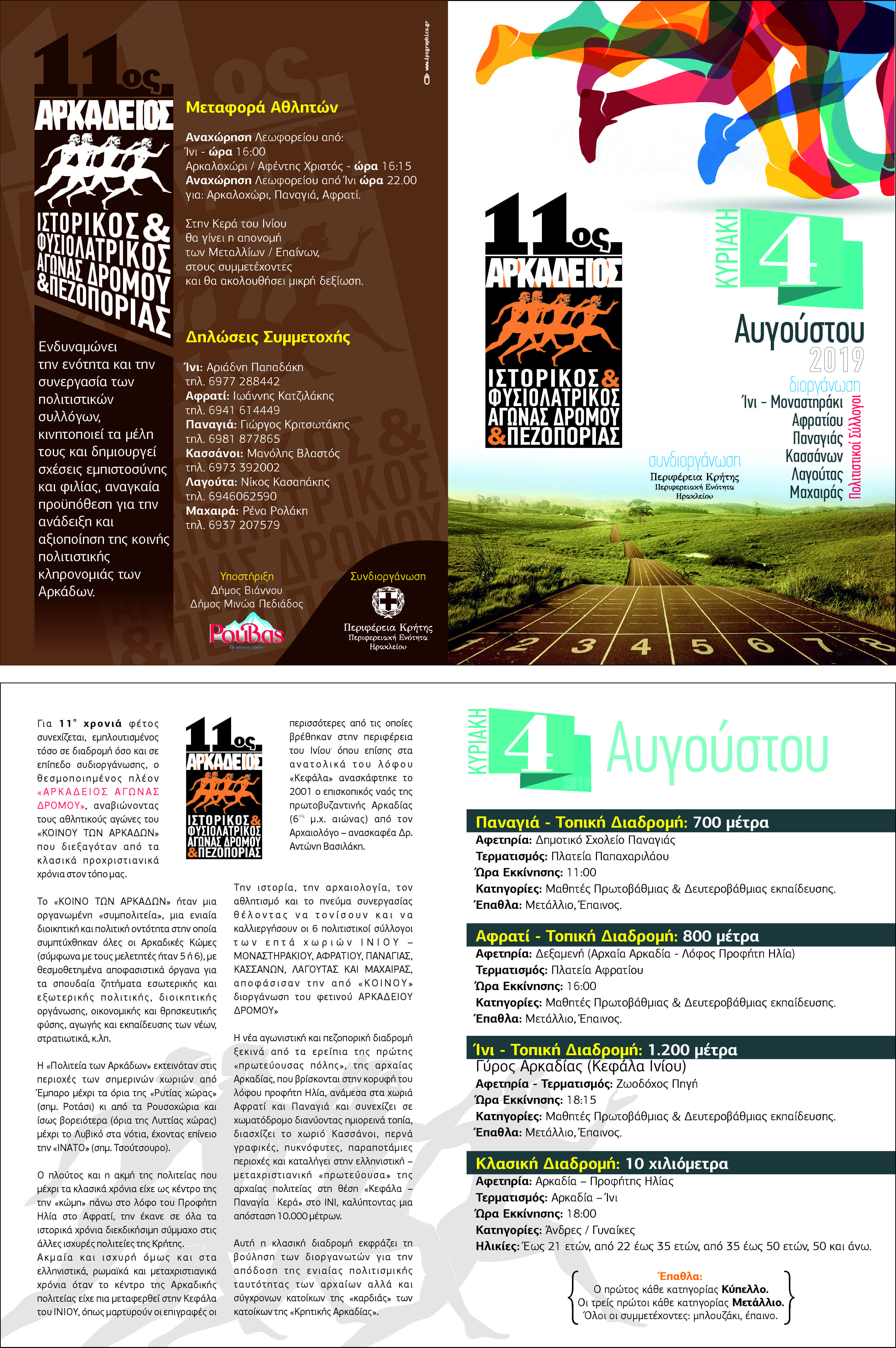 Την ιστορία, την αρχαιολογία, τον αθλητισμό και το πνεύμα συνεργασίας θέλοντας να τονίσουν και να καλλιεργήσουν οι 6 πολιτιστικοί σύλλογοι των επτά χωριών ΙΝΙΟΥ – ΜΟΝΑΣΤΗΡΑΚΙΟΥ, ΑΦΡΑΤΙΟΥ, ΠΑΝΑΓΙΑΣ, ΚΑΣΣΑΝΩΝ, ΛΑΓΟΥΤΑΣ ΚΑΙ ΜΑΧΑΙΡΑΣ, αποφάσισαν την από «ΚΟΙΝΟΥ» διοργάνωση του φετινού ΑΡΚΑΔΕΙΟΥ ΔΡΟΜΟΥ.