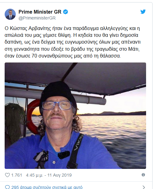 Την ευγνωμοσύνη του για την αλληλεγγύη που επέδειξε κατά την τραγωδία στο Μάτι και την θλίψη του για την απώλεια του Κώστα Αρβανίτη, του ψαρά που έσωσε δεκάδες ανθρώπους, εξέφρασε ο πρωθυπουργός Κυριάκος Μητσοτάκης.