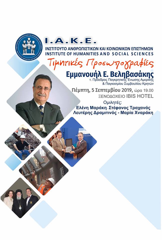 Το Ινστιτούτο Ανθρωπιστικών και Κοινωνικών Επιστημών (Ι.Α.Κ.Ε.) εγκαινιάζει μια νέα σειρά εκδηλώσεων με τίτλο «Τιμητικές προσωπογραφίες», με πρώτο τιμώμενο τον Μανώλη Ε. Βεληβασάκη, τ. Πρόεδρο Παγκρητικής Ένωσης Αμερικής και Παγκοσμίου Συμβουλίου Κρητών.