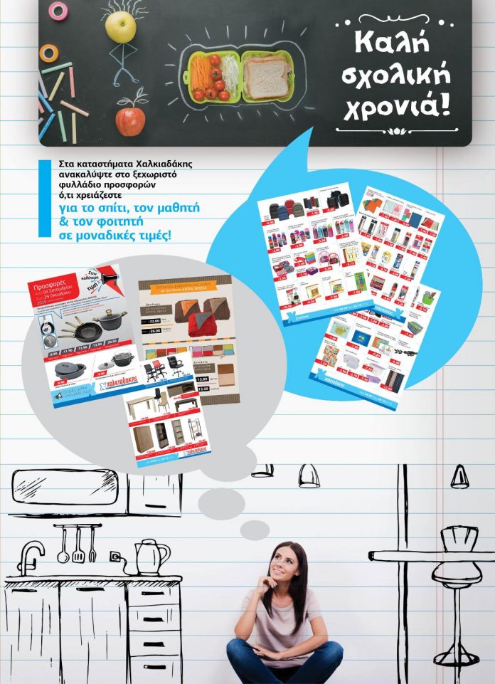 Τα super markets Χαλκιαδάκης σας προσφέρουν ότι χρειάζεστε για το σπίτι, τον μαθητή και τον φοιτητή σε μοναδικές τιμές. Στα νέα φυλλάδια προσφορών μπορείτε να βρείτε προσφορές για σχολικά είδη, έπιπλα και μικροέπιπλα για όλους. Προμηθευτείτε το νέο μας φυλλάδιο από τα καταστήματα Χαλκιαδάκης (ή ηλεκτρονικά στο https://www.xalkiadakis.gr/el/fylladio ) και επωφεληθείτε από τις προσφορές για ένα χαρούμενο φθινόπωρο. Συγκεκριμένα, μπορείτε να βρείτε ως και 29 Οκτωβρίου σχολικές τσάντες και σακίδια πλάτης εφηβικά από 4.90€, ισοθερμικό τσαντάκι φαγητού από 5.00€, μαρκαδόρους γραφής 12 τεμ. από 0.75€ και ότι άλλο χρειαστούν οι μικροί μας φίλοι για μια εποικοδομητική σχολική χρονιά. Μεγάλη ποικιλία και σε επώνυμες τσάντες Paxos σε πολλά σχέδια και χρώματα, καθώς και παγούρια αλουμινίου για μικρούς και μεγάλους.
