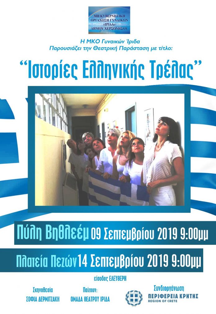 Με την στήριξη της Περιφέρειας Κρήτης, η Ομάδα Θεάτρου του Συλλόγου Γυναικών με επωνυμία «ΜΚΟ Γυναικών Ίριδα» θα παρουσιάσει την Θεατρική Παράσταση με τίτλο «Ιστορίες ελληνικής τρέλας» την Δευτέρα 9 στη Πύλη Βηθλεέμ του Δ. Ηρακλείου και το Σάββατο 14 Σεπτεμβρίου στη Πλατεία Πεζών στις 9:00 μ.μ. Η παράσταση θα πραγματοποιηθεί με ελεύθερη είσοδο για τους πολίτες.