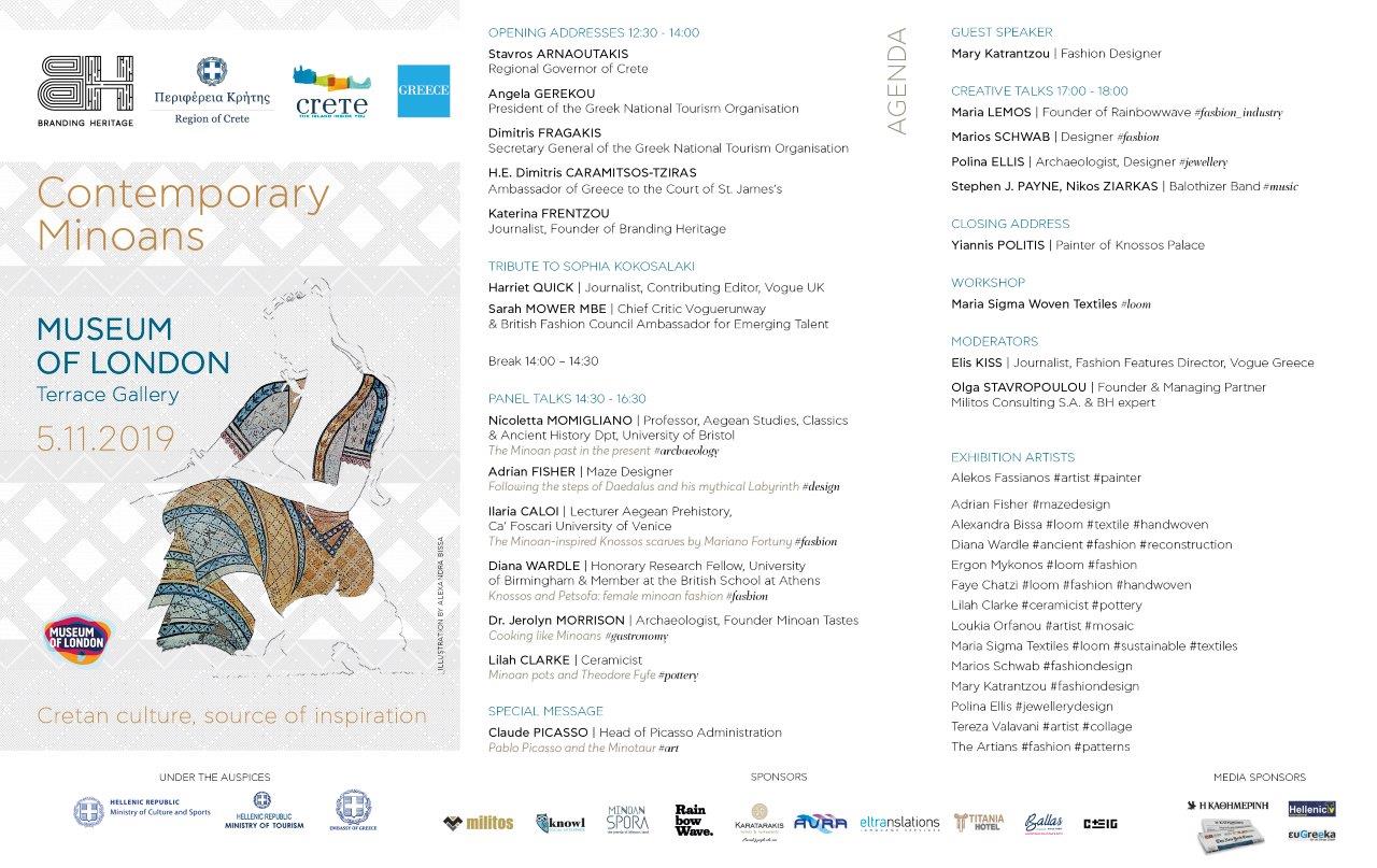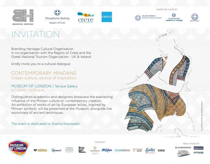 Η εκδήλωση με θέμα «Σύγχρονοι Μινωίτες: Ο Κρητικός πολιτισμός, πηγή έμπνευσης» (Contemporary Minoans: Cretan culture, source of inspiration) διοργανώνεται με πρωτοβουλία του Οργανισμού Πολιτισμού Branding Heritage (BH) με την υποστήριξη της Περιφέρειας Κρήτης και του Ελληνικού Οργανισμού Τουρισμού Ηνωμένου Βασιλείου και Ιρλανδίας, την Τρίτη, 5 Νοεμβρίου 2019 στο Μουσείο του Λονδίνου (Μuseum of London,150 London Wall, Λονδίνο EC2Y 5HN χάρτης) με ώρα έναρξης 12.30 μ.μ.. Η εκδήλωση πραγματοποιείται υπό τις αιγίδες των Υπουργείων Πολιτισμού, Τουρισμού και της Πρεσβείας της Ελλάδας στο Ηνωμένο Βασίλειο.