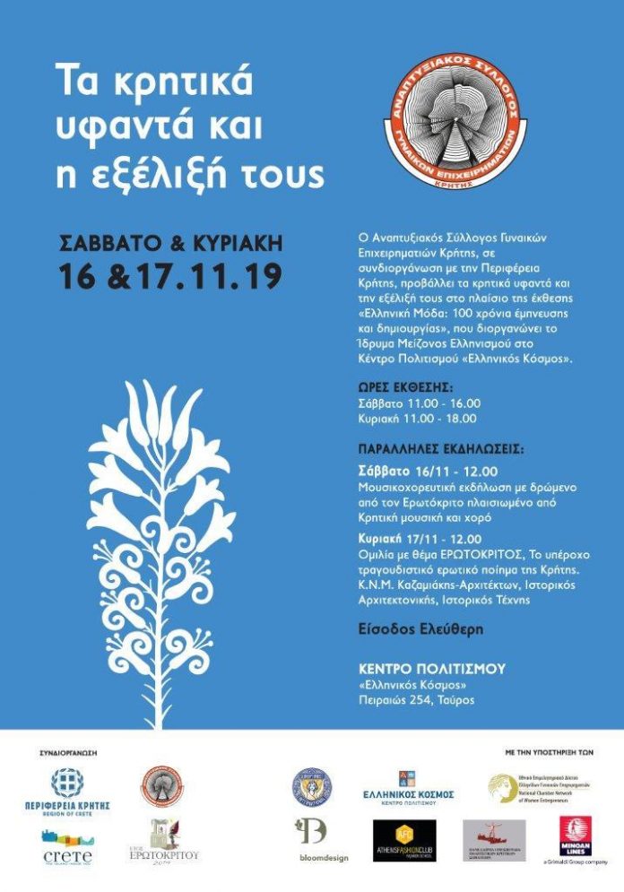 Πρόκειται για μια διήμερη εκδήλωση με συνδιοργανωτές την Περιφέρεια Κρήτης και τον Αναπτυξιακό Σύλλογο Γυναικών Επιχειρηματιών Κρήτης με τίτλο “Τα Κρητικά υφαντά και η εξέλιξη τους” που θα παρουσιαστεί στις 16 και 17 Νοεμβρίου στο Ίδρυμα Μείζονος Ελληνισμού στο Κέντρο Πολιτισμού Ελληνικός Κόσμος.
