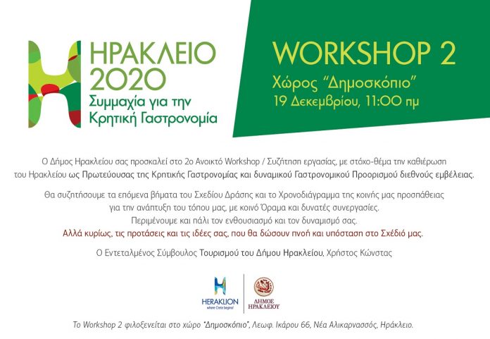 Την 2η ανοικτή συζήτηση εργασίας, με θέμα την καθιέρωση του Ηρακλείου ως Πρωτεύουσα της Κρητικής Γαστρονομίας και δυναμικό Γαστρονομικό Προορισμό διεθνούς εμβέλειας, διοργανώνει την Πέμπτη 19 Δεκεμβρίου 2019 ο Εντεταλμένος Σύμβουλος Τουρισμού του Δήμου Ηρακλείου, Χρήστος Κώνστας.