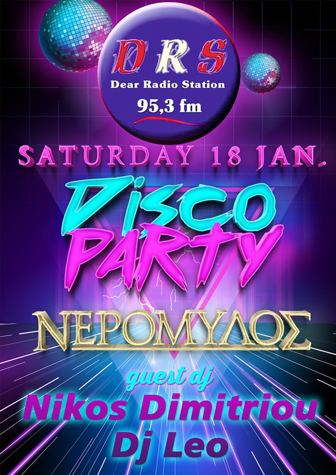 Σαββατο 18 Ιανουαριου καλωσοριζουμε την Νεα χρονια 2020 Με το ποιο δυνατο Disco party Μαζι μας ο κορυφαίος DJ Νίκος Δημήτριου (Video Disco, Athens) και ο κορυφαιος( Dj Leo station one Athens) . Επίσης Μαζί Μας οι Kings Dance At Rap Γιάννης Πατερακης – Νίκος Σφακιανάκης Και Οι Σχολη Χορού Dance Spirit Studio Mε Μοναδικά Show Της Εποχής!!