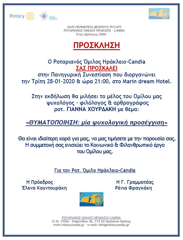 Ο Ροταριανός Όμιλος Ηράκλειο-Candia ΣΑΣ ΠΡΟΣΚΑΛΕΙ στην Πανηγυρική Συνεστίαση που διοργανώνει την Τρίτη 28-01-2020 & ώρα 21:00, στο Marin dream Hotel.