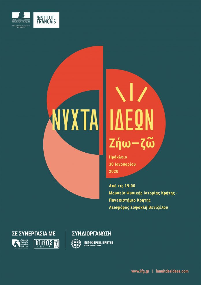 Το Γαλλικό Ινστιτούτο Ελλάδος οργανώνει για 7η χρονιά τη Νύχτα Ιδεών.  Το ετήσιο ραντεβού που συγκεντρώνει διανοούμενους, καλλιτέχνες, ερευνητές, δημοσιογράφους και το ευρύ κοινό που του αρέσουν οι συζητήσεις. Για πρώτη φορά στην Ελλάδα, η εκδήλωση συντονίζεται με τα υπόλοιπα Γαλλικά Ινστιτούτα και τους συνεργάτες τους σε όλο τον κόσμο την ίδια ημέρα, στις 30 Ιανουαρίου, και επεκτείνεται σε τέσσερις πόλεις: Αθήνα, Ηράκλειο, Μυτιλήνη και Θεσσαλονίκη. Μια νύχτα για να γιορτάσουμε μαζί την ελεύθερη ροή της σκέψης και της γνώσης προτείνοντας, μέσα στο ίδιο βράδυ, ομιλίες, συναντήσεις, φόρουμ και στρογγυλές τράπεζες, αλλά και προβολές, καλλιτεχνικές παραστάσεις, φιλοσοφικά συμπόσια… γύρω από ένα κοινό θέμα, που κάθε τόπος προσεγγίζει με τον δικό του τρόπο. Η Νύχτα Ιδεών διοργανώνεται με τη δωρεά του Ιδρύματος Σταύρος Νιάρχος (ΙΣΝ) και με την υποστήριξη του Institut français (Παρίσι).
