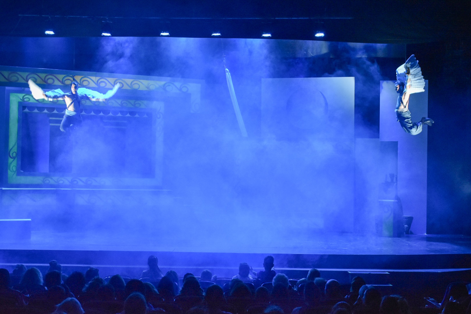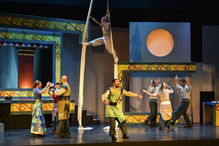 Ταλαντούχοι καλλιτέχνες, εναέριοι ακροβάτες, ηθοποιοί, χορευτές, ξυλοπόδαροι, με ευφάνταστα κοστούμια και ευρηματικά σκηνικά, πλαισιώνουν την αφήγηση του μύθου.