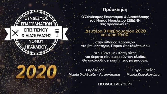 Ο Σύνδεσμος Επισιτισμού & Διασκέδασης Νομού Ηρακλείου σας προσκαλεί την Δευτέρα 3 Φεβρουαρίου 2020 και ώρα 19:00 στην αίθουσα Καρούζου στο Επιμελητήριο Ηρακλείου, Πάρκο Θεοτοκόπουλου.