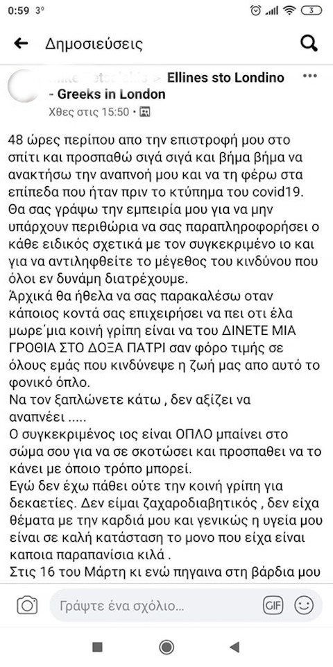 «48 ώρες περίπου απο την επιστροφή μου στο σπίτι και προσπαθώ σιγά σιγά και βήμα βήμα να ανακτήσω την αναπνοή μου και να τη φέρω στα επίπεδα που ήταν πριν το κτύπημα του covid19.