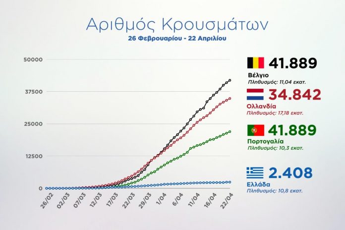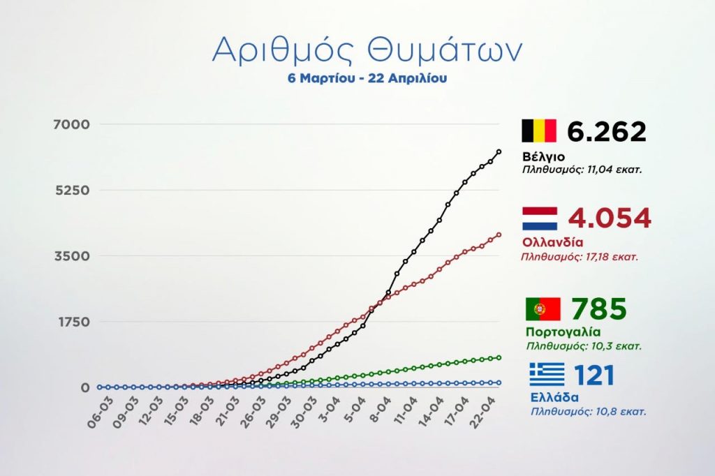 Η επιτυχία του σχεδίου μας μέχρι σήμερα απεικονίζεται στα διαγράμματα των κρουσμάτων & θυμάτων σε σύγκριση με άλλες χώρες της ΕΕ με αντίστοιχο πληθυσμό. Αυτή η εικόνα είναι για μας θυμίζει γιατί πήραμε αυτά τα μέτρα.
