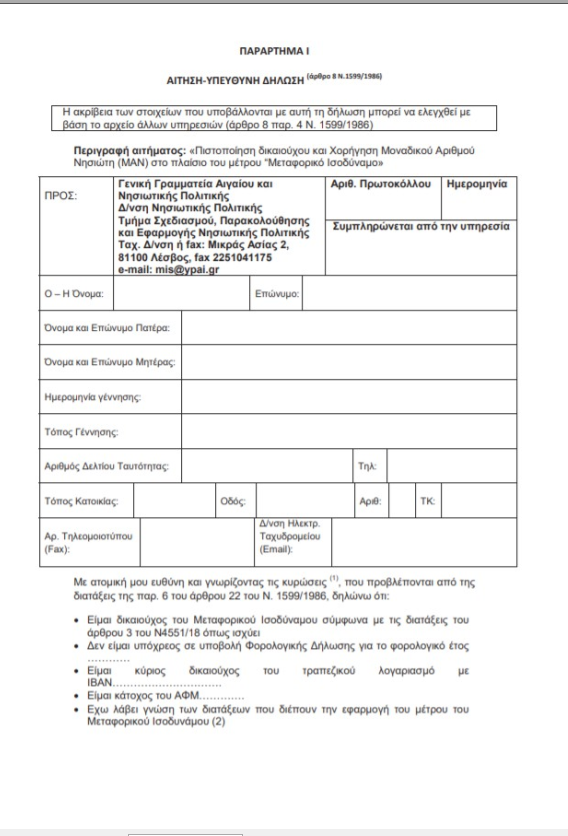 Επισυνάπτεται υπόδειγμα της αίτησης όπου αναγράφονται και τα απαραίτητα δικαιολογητικά που υποχρεούται να προσκομίσει ο αιτών/ούσα στις αρμόδιες υπηρεσίες της Γενικής Γραμματείας Αιγαίου και Νησιωτικής Πολιτικής.
