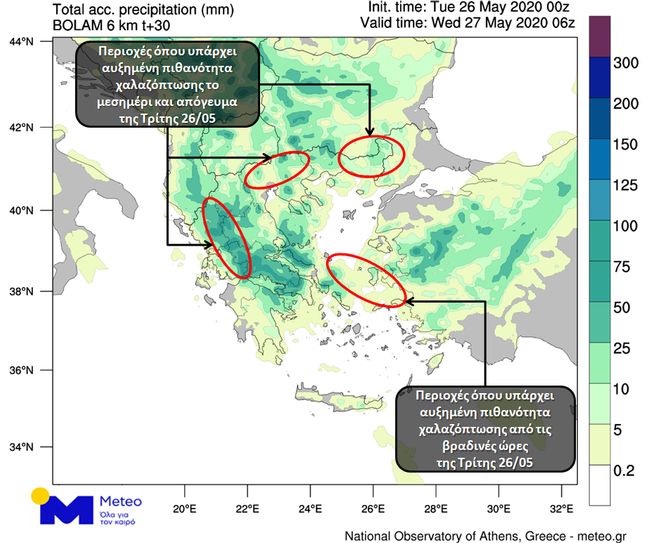 Αυξημένη πιθανότητα χαλαζοπτώσεων υπάρχει κυρίως το μεσημέρι και το απόγευμα στην Ήπειρο, στην Κεντρική Μακεδονία και στη Θράκη και από τις βραδινές ώρες κατά κύριο λόγο στο Ανατολικό Αιγαίο.