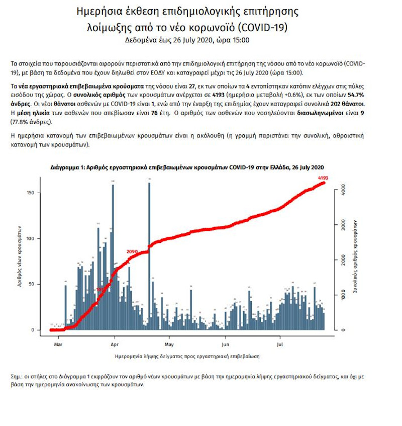 «Σήμερα ανακοινώνουμε 27 νέα κρούσματα του νέου ιού στη χώρα, εκ των οποίων τα 4 εντοπίστηκαν κατόπιν ελέγχων στις πύλες εισόδου της χώρας. Ο συνολικός αριθμός των κρουσμάτων είναι 4.193, εκ των οποίων το 54,7% αφορά άνδρες.