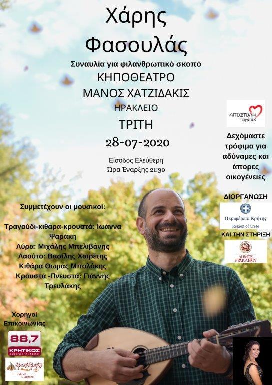 Η συναυλία θα περιέχει γνωστά τραγούδια της Κρητικής μουσικής καθώς και δημιουργίες – συνθέσεις του Χάρη Φασουλά.